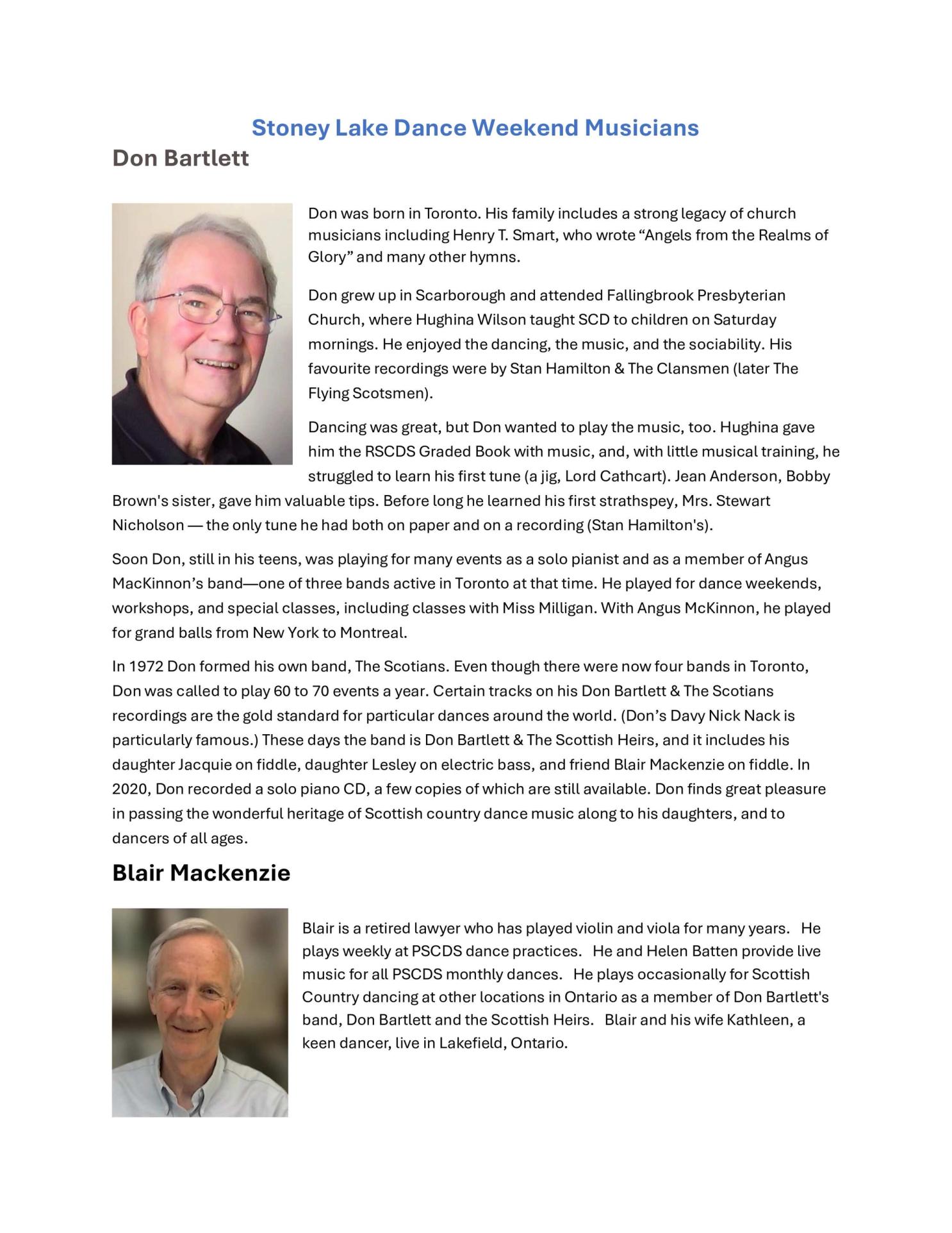 Don Bartlett and Blair Mackenzie are returning as our musicians (see bios).
